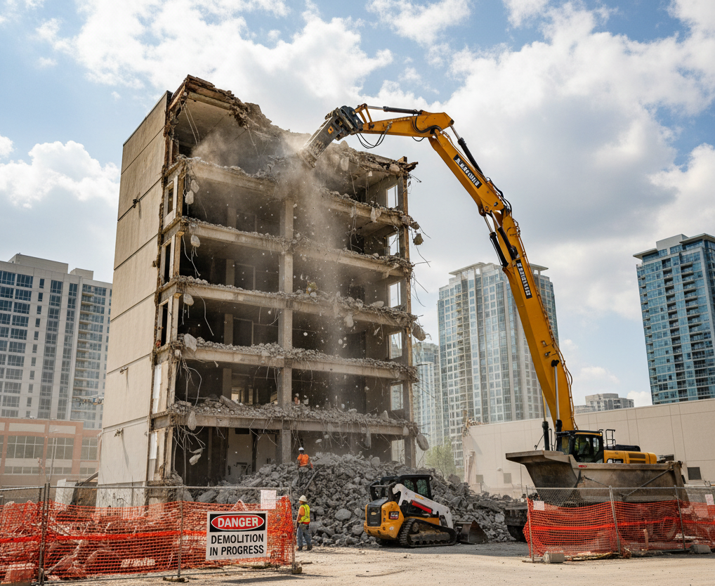Мы специализируемся на полном цикле работ, что включает не только снос, но и подготовку площадки к дальнейшему использованию. Наши специалисты проводят точный расчет сметы и составляют план работ, минимизируя риски и влияние на окружающую инфраструктуру. Мы осуществляем безопасный демонтаж зданий с применением современной тяжелой техники и аттестованных специалистов. Безопасность — наш главный приоритет при выполнении заказов в черте города.